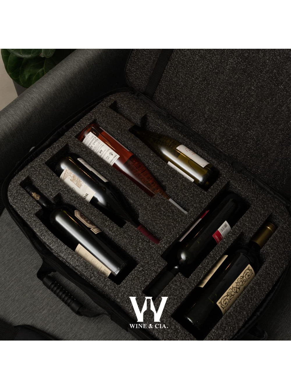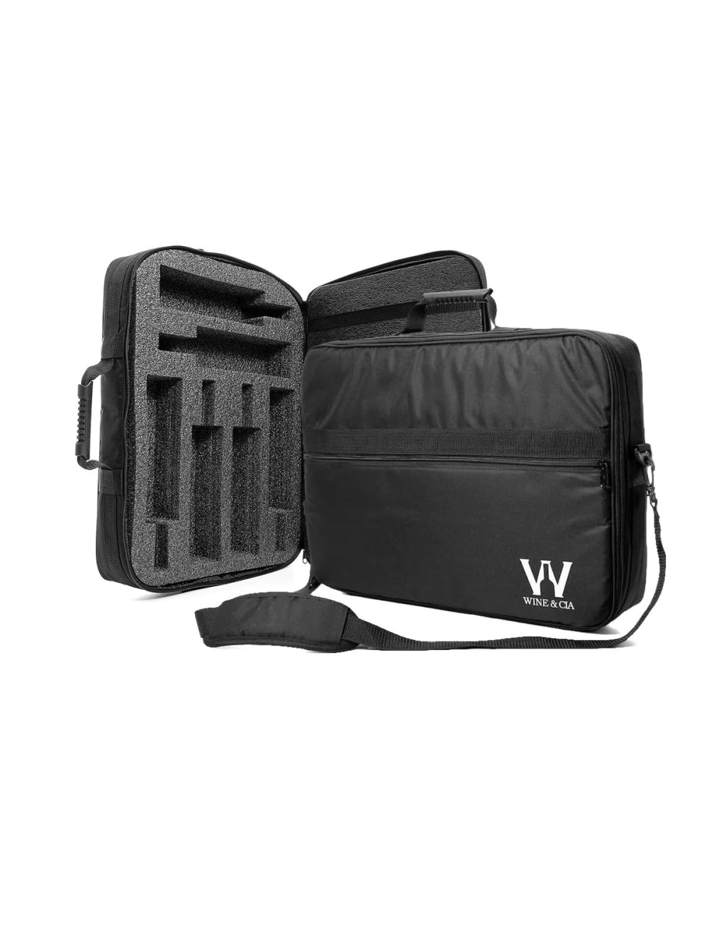 Mala para viagem com espuma protetora de garrafas.